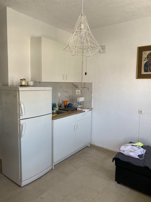 • мини кујна со рамна плотна, мал фрижидер, опремена со прибор и садови за готвење,