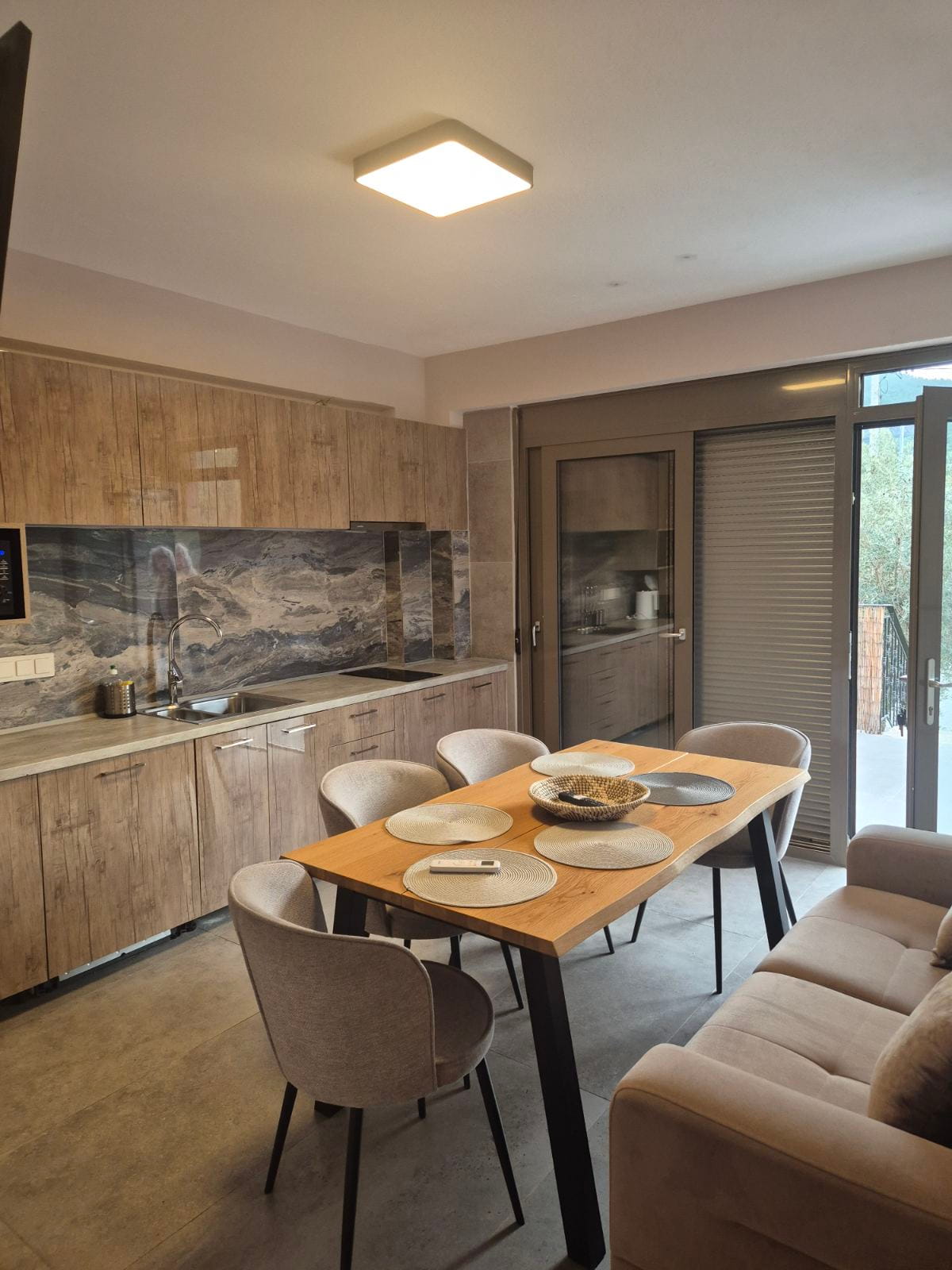 1/5 дуплекс – бр.1 – се наоѓа на прв спрат.Дуплексот располага со три големи простории.Има 2 посебни спални соби со брачни кревети и дневна просторија поврзана со трпезарија и кујна каде се наоѓа и кауч кој не се спушта.Кујната е целосно опремена, со најнов инвентар,исто така располага со тоалет и балкон на кој се излегува и има летна гарнитура за седење. Може да се сместат максимум 4 возрасни лица и 2 деца до 12 години. ( Има можност да се стави дополнително легло доколку се 2 деца до 12г)