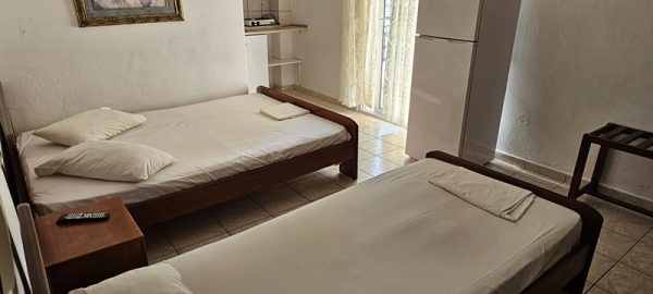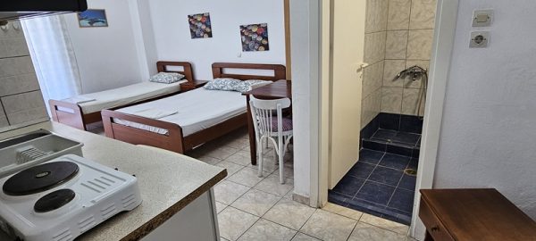 Студиото располага со еден дупол и два поединечни кревети.Во сколопот на собата е кујната која е комплетно опремена со кујнски инвентар.Има решо со две рингли,аспиратор и фрижидер голем.Излегува на комотна тераса со маса и столици .Студиото има клима уред,тв и стандардно купатило со вц.