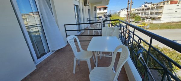 Апартманот располага со две спални соби меѓусебно одвоени со врата.Во едната спална соба има еден дупол кревет еден поединечен кревет клима уред,тв + кујна комплетно опремена со кујнски инвентар,електрично решо,голем фрижидер.Во другата спална соба има дупол кревет ,плакар за алишта.И од едната и од другата спална соба се излегува на тераса со маса и столици. Апртманот има стандардно купатило и вц.