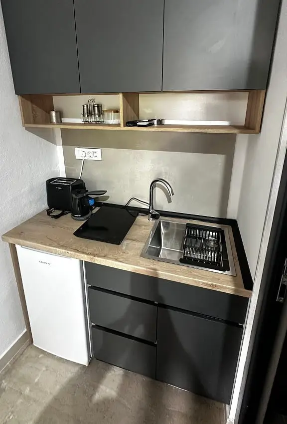 Апартман бр.4: едноспален апартман (со двоен кревет + еден единечен) кујна со рерна, голем фрижидер, терпезариска маса и софа на спуштање 140cm (капацитет за 4возр + 1дете или 3 возрасни и 2 деца)